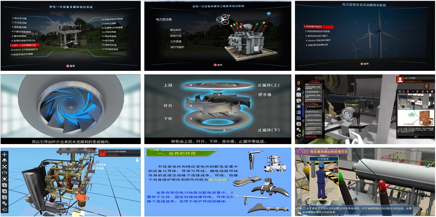 “電力基礎知識多媒體教學資源庫軟件系列”基于多媒體開發平臺所開發,運用三維動畫、多媒體教學、三維虛擬交互等教學方式,構建針對電力系統中發電、輸電、變電、配電等專業的多媒體教學培訓內容,以各專業的理論知識教學為基礎,并與專業中的實際業務內容相結合可應用于各大高等學校、專職院校等基礎課程的教學。解決傳統教學中的抽象理論和與實際無法結合的問題。